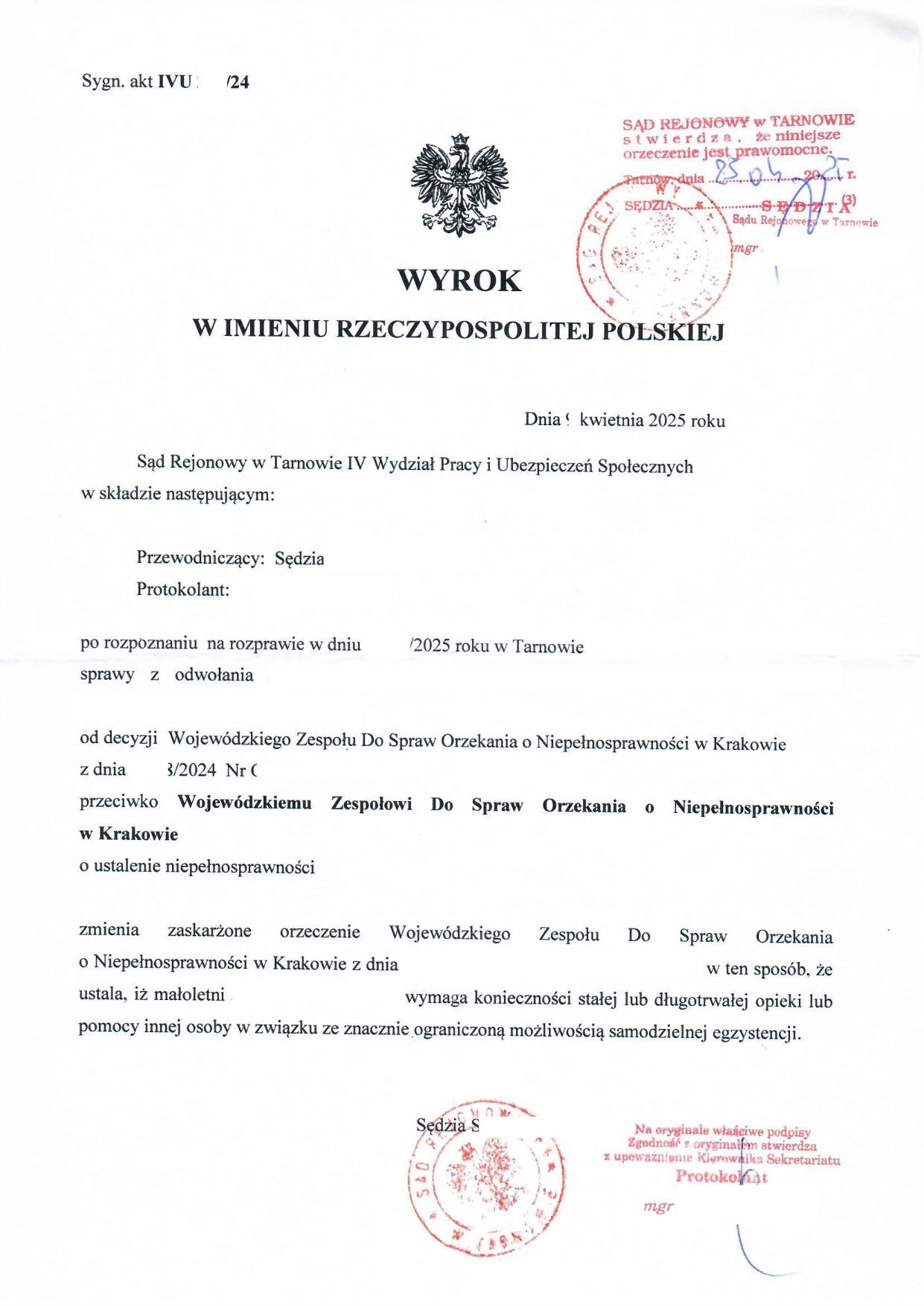Sąd Rejonowy w Tarnowie zmienia orzeczenie Wojewódzkiego Zespołu Do Spraw Orzekania o Niepełnosprawności w Krakowie i uznaje, że małoletni wymaga konieczności stałej lub długotrwałej opieki innej osoby w związku ze znacznie ograniczoną możliwością samodzielnej egzystencji.