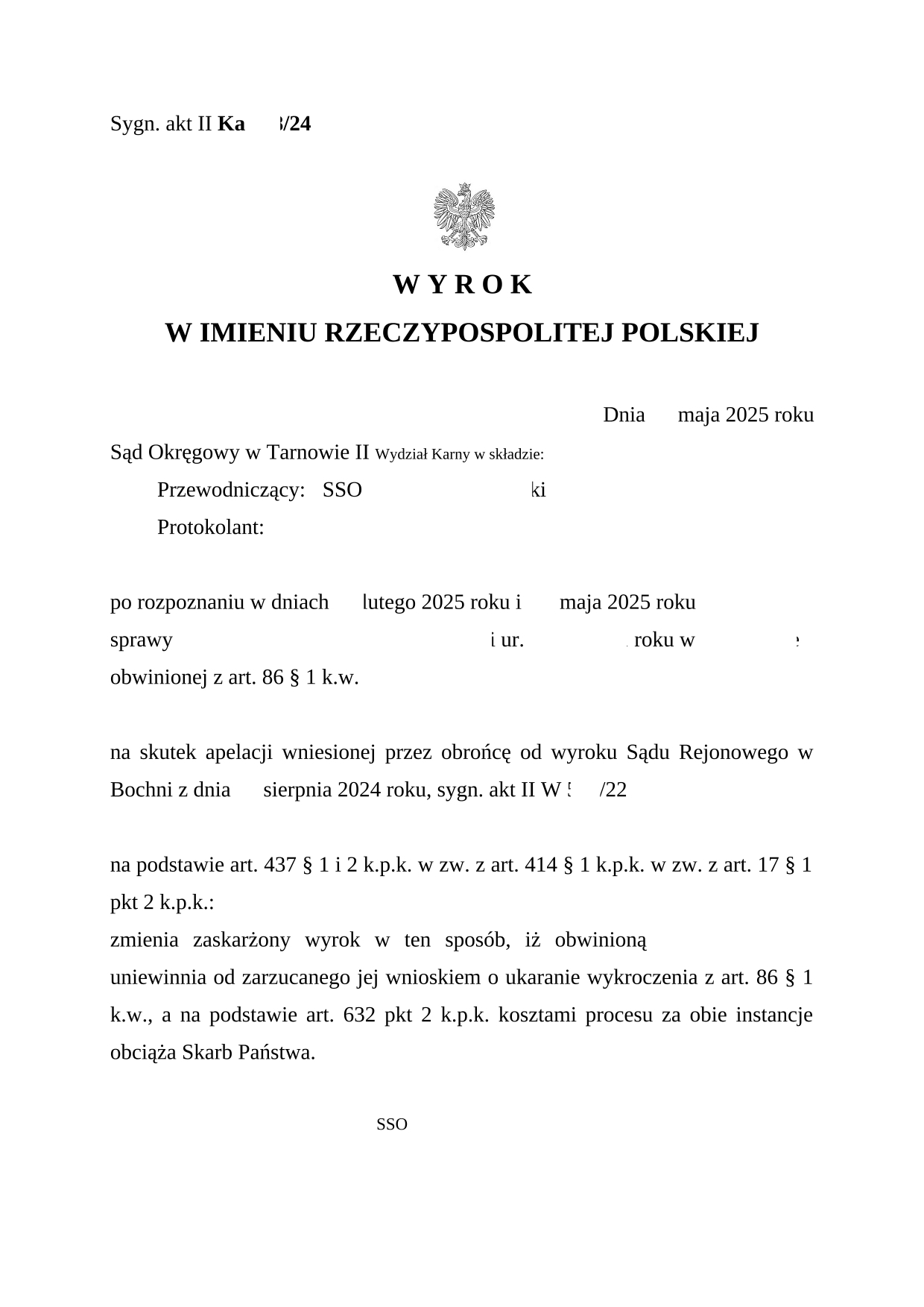 Po przeprowadzeniu postępowania odwoławczego, Sąd Okręgowy w Tarnowie uniewinnił naszą Klientkę od zarzucanego jej wnioskiem o ukaranie wykroczenia z art. 86 § 1 kw, a na podstawie art. 632 pkt 2 kpk kosztami procesu za obie instancje obciążył Skarb Państwa.